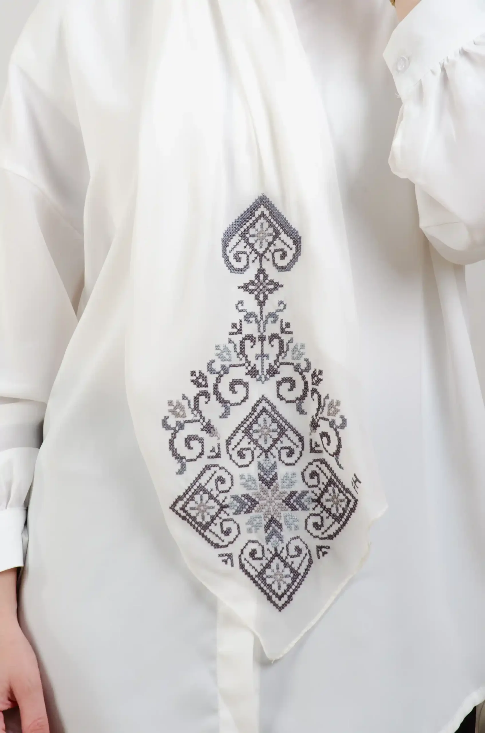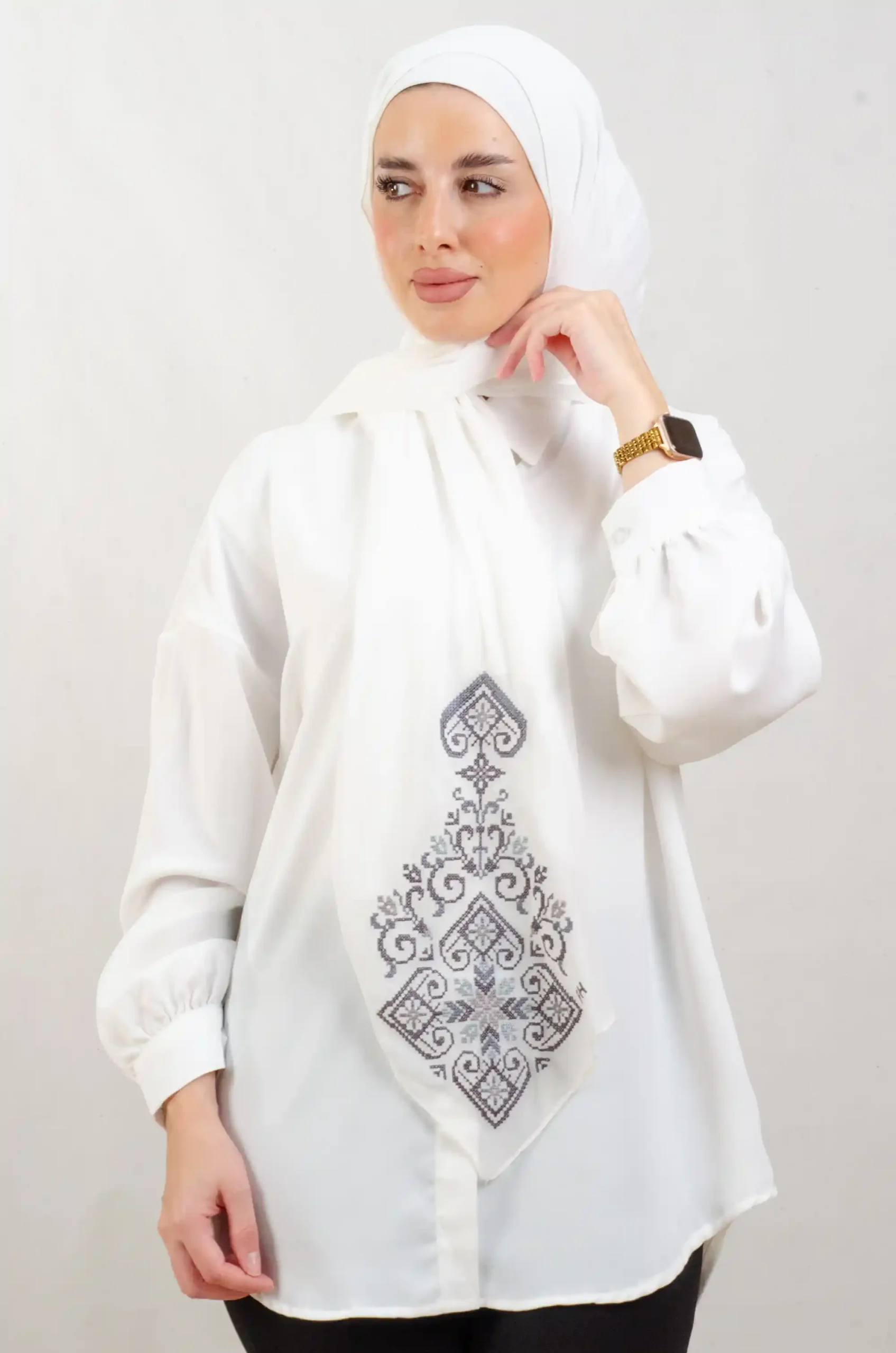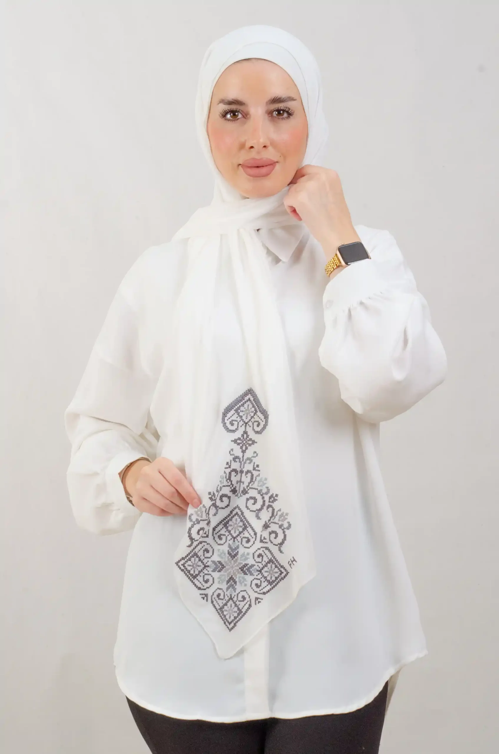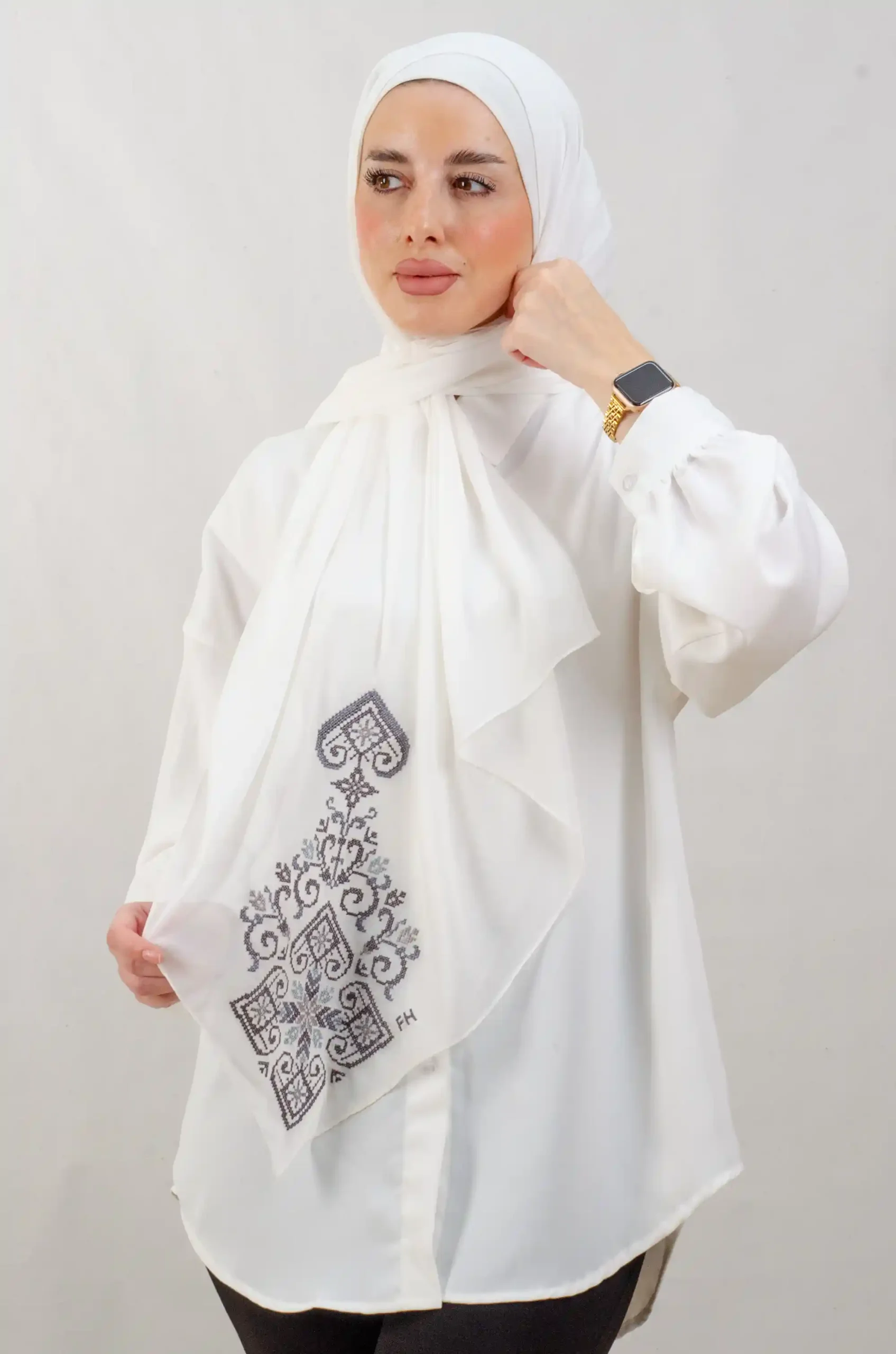شال الخليل تطريز كحلي من فلاحي هاوس هو حجاب مطرز ومريح وجيد التهوية مصنوع من قماش الشيفون جورجيت. مثالي للارتداء اليومي والمناسبات.