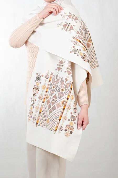 استمتع بأناقة التراث الفلسطيني الأصيل مع شال كتف أوف وايت مطرز نباتي مكس بني. مصنوع من قماش الجوخ الدافئ بقصة عصرية تلتف بانسيابية حول الرقبة، ليجمع بين الراحة والهوية في قطعة شتوية مميزة.