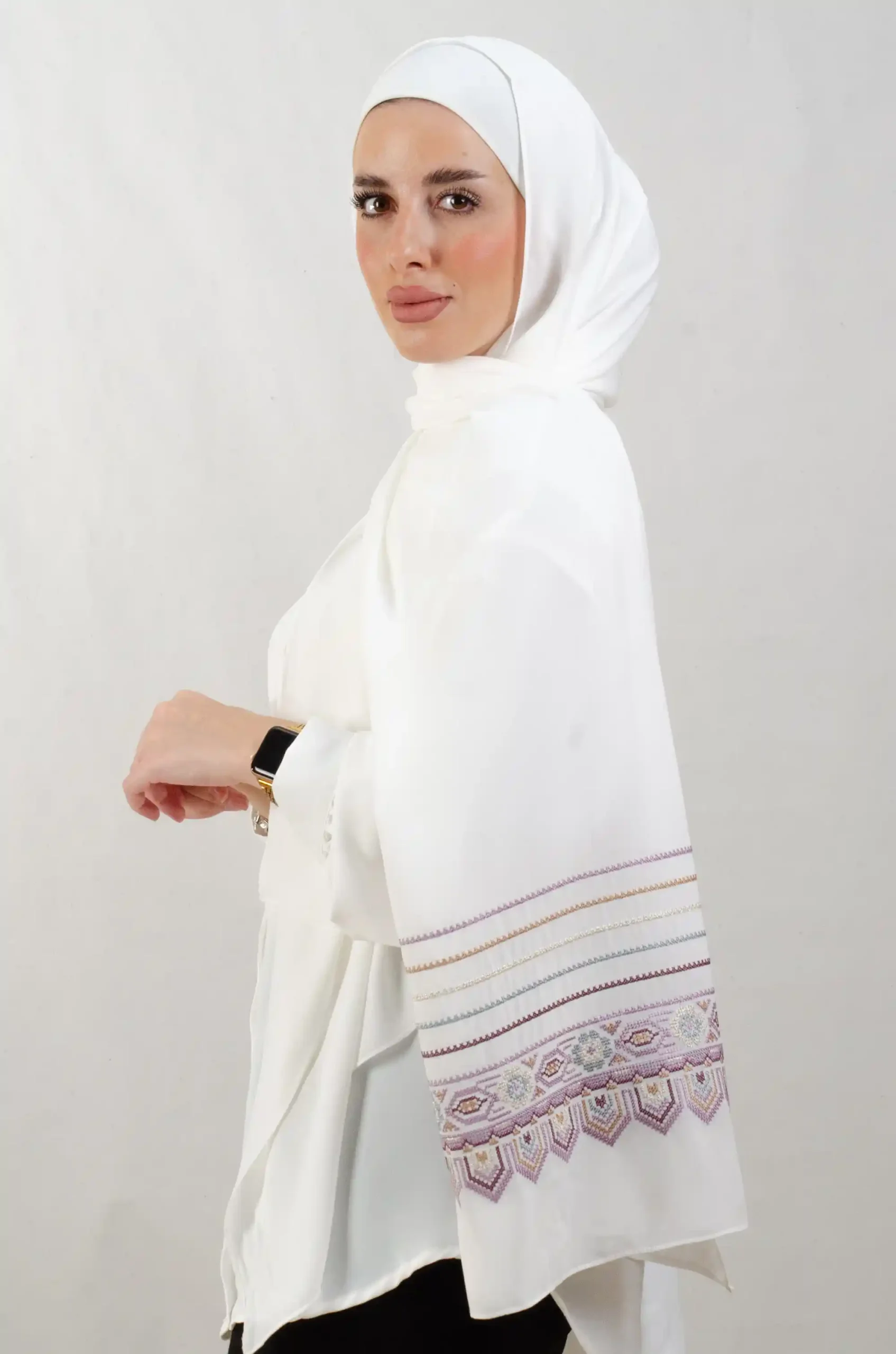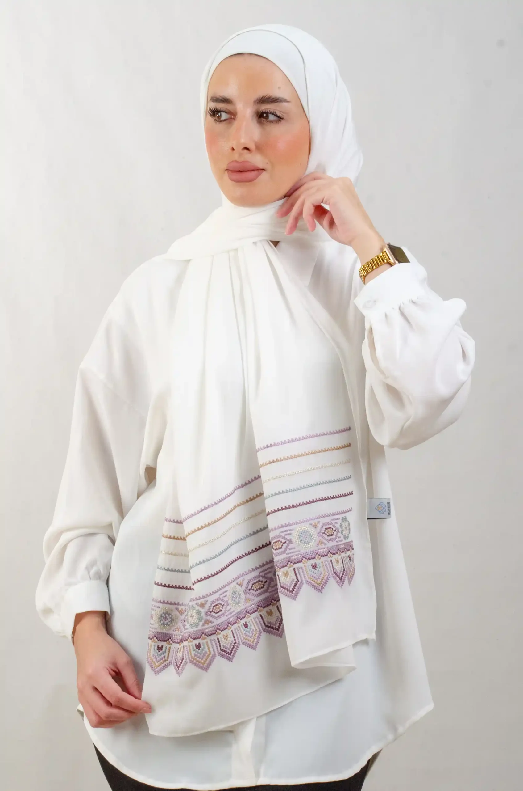 The Beehive-perple Tatreez Shawl is a cozy, breathable embroidered hijab made from Crepe fabric. perfect for everyday wear and celebrations.