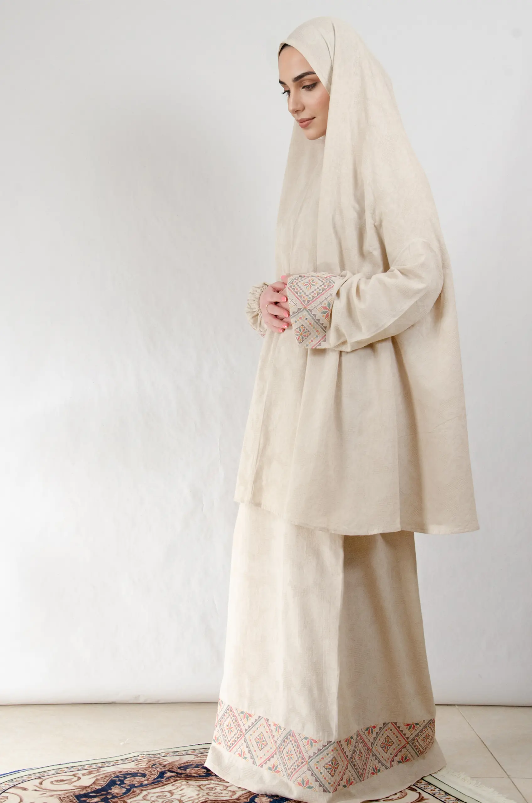 Crafted to honor both worship and heritage, the set combines a soft, breathable fabric with refined Fallahi embroidery inspired by traditional Palestinian handcraft. The neutral beige base enhances the embroidery’s depth and detail, allowing every stitch to stand out with quiet sophistication.