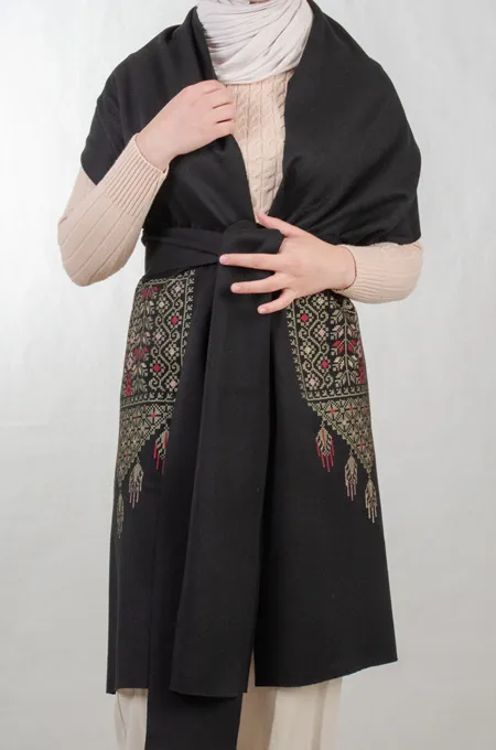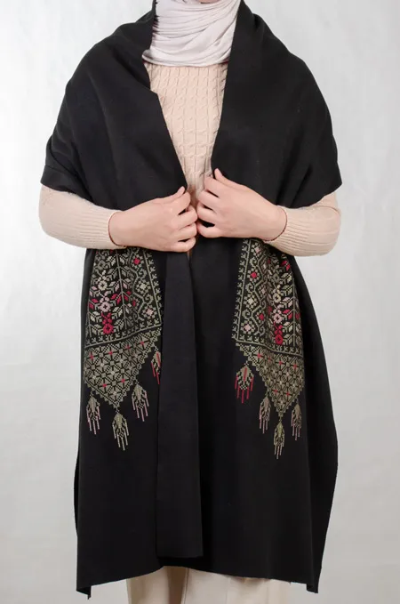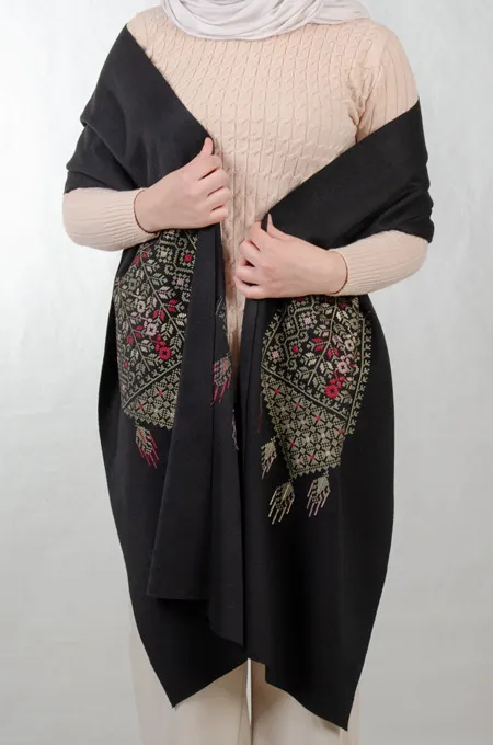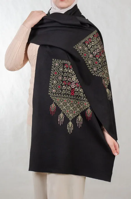Black Makrama Qubbeh Olive Embroidered Shoulder Shawl in a warm winter design featuring Makrama Qubbeh embroidery, detailed stitching, and mirror accents inspired by Central Region heritage.