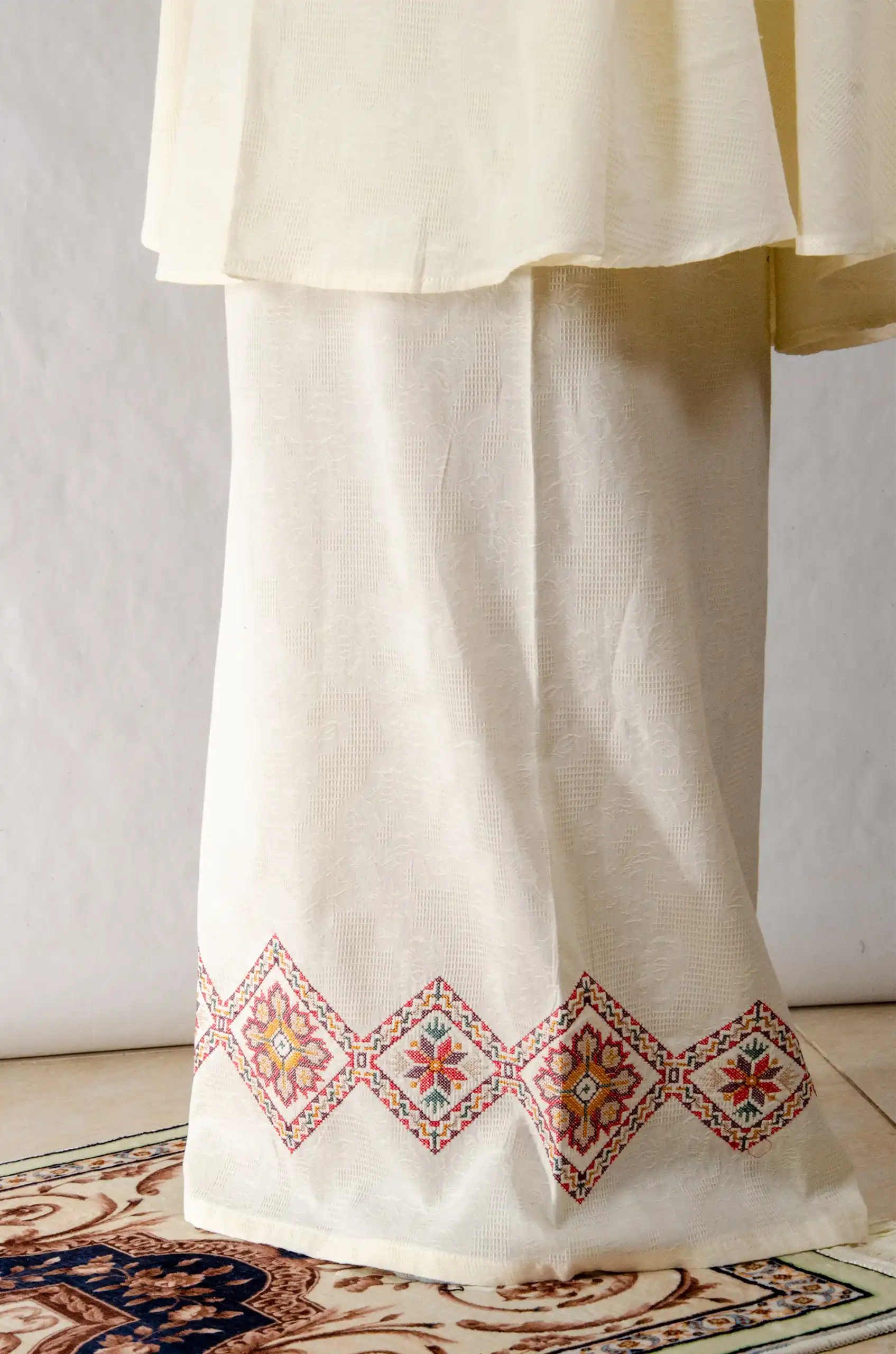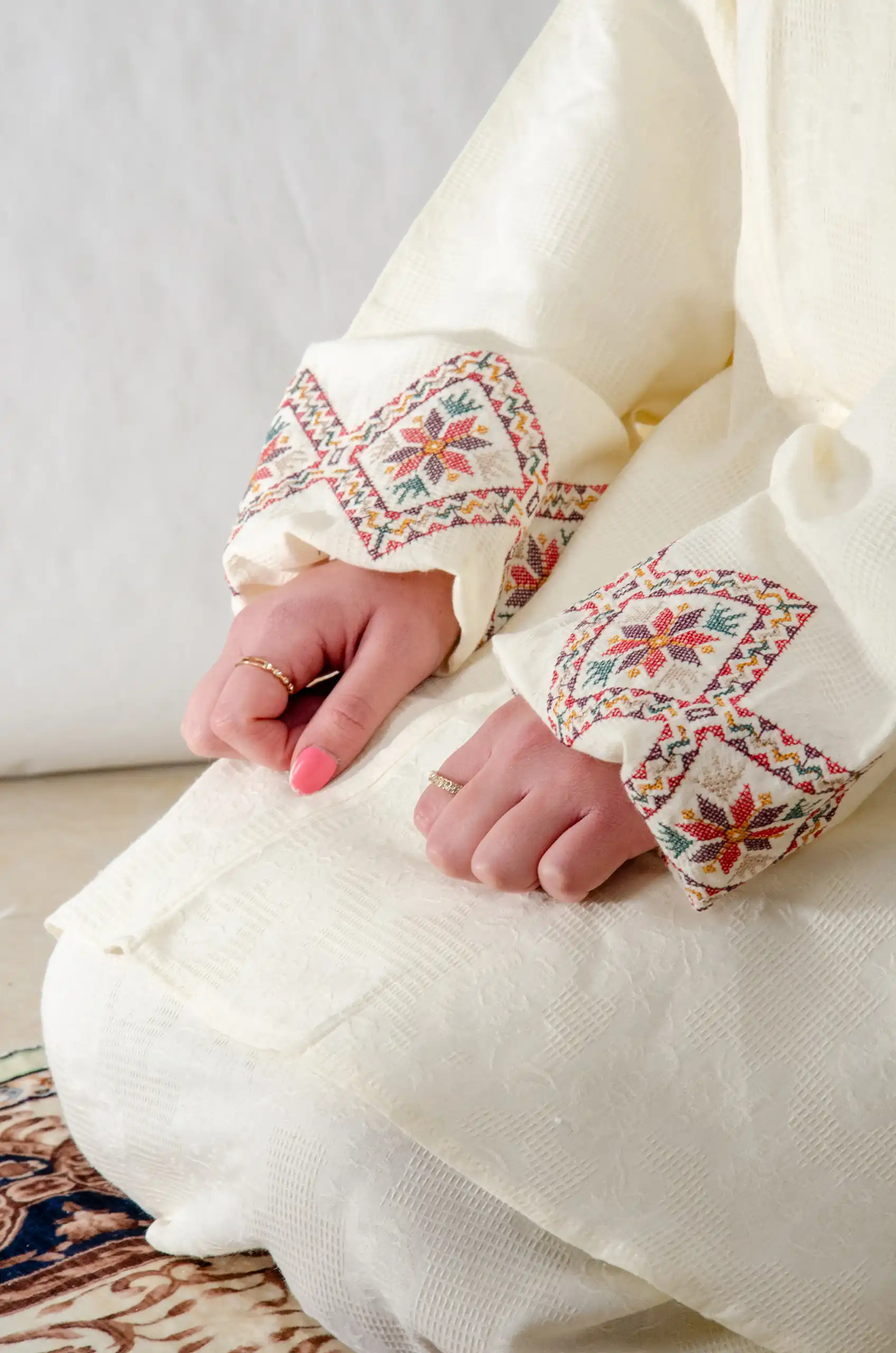 Crafted to honor both worship and heritage, the set combines a soft, breathable fabric with refined Fallahi embroidery inspired by traditional Palestinian handcraft. The neutral cream base enhances the embroidery’s depth and detail, allowing every stitch to stand out with quiet sophistication.