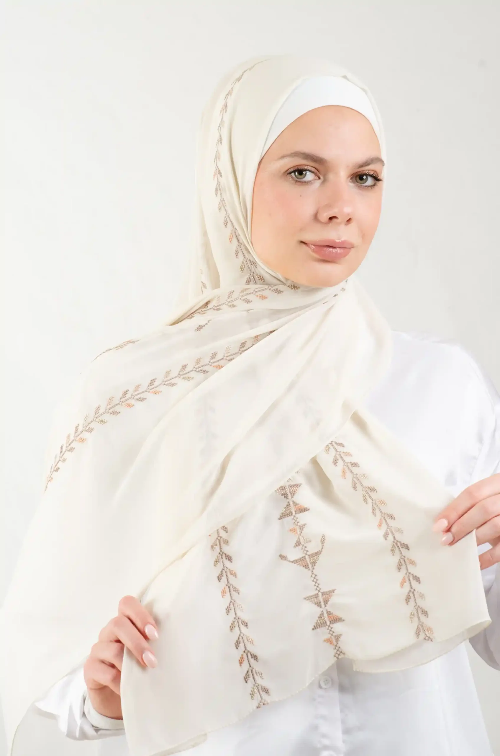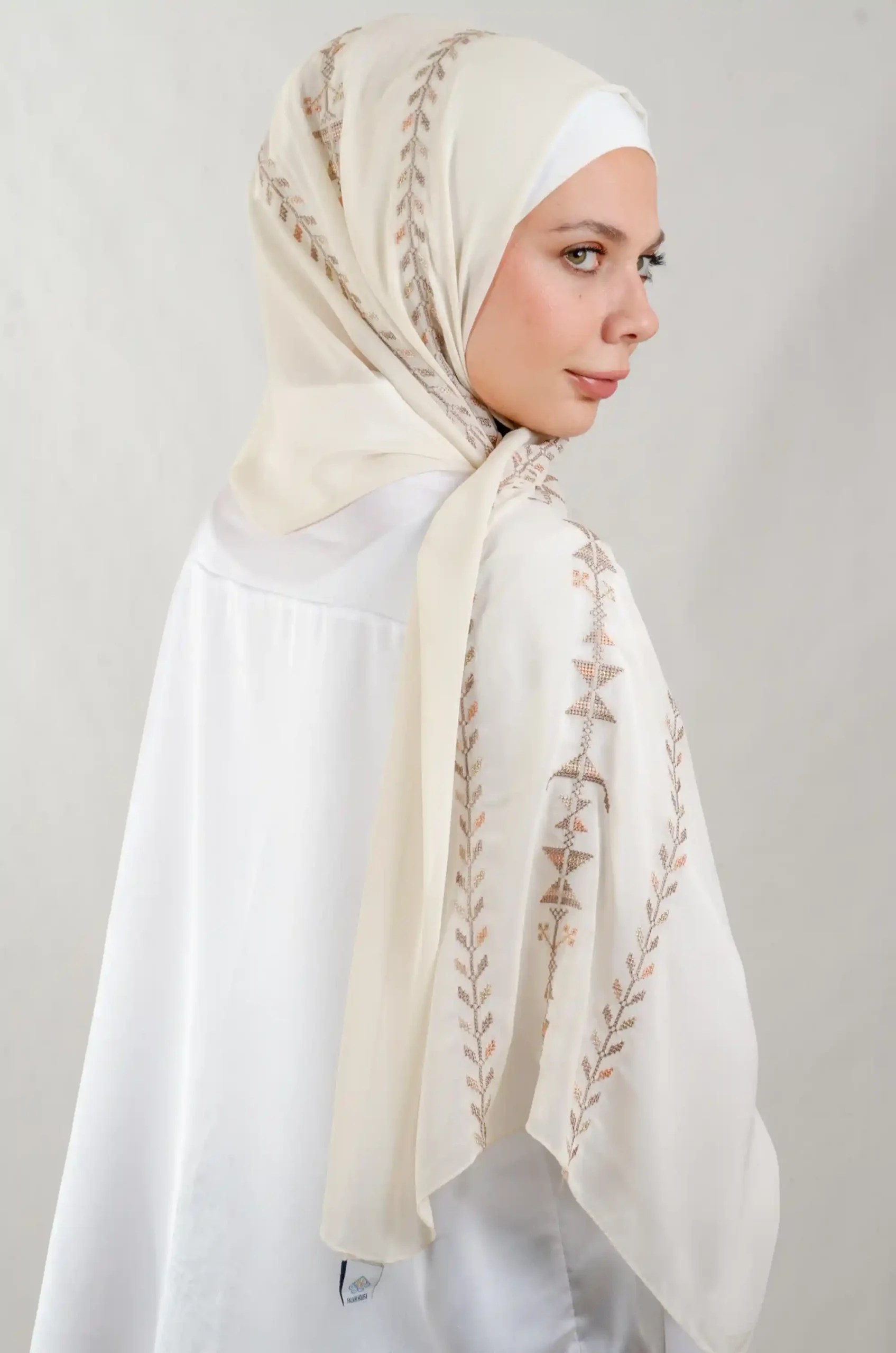 The Cypress Vine Beige Tatreez Shawl is a cozy and breathable embroidered hijab crafted from premium Georgette chiffon fabric. Designed with elegant Tatreez embroidery in Cypress Vine Beige, it offers a graceful drape and lightweight comfort. Perfect for daily wear as well as festive gatherings and celebrations.