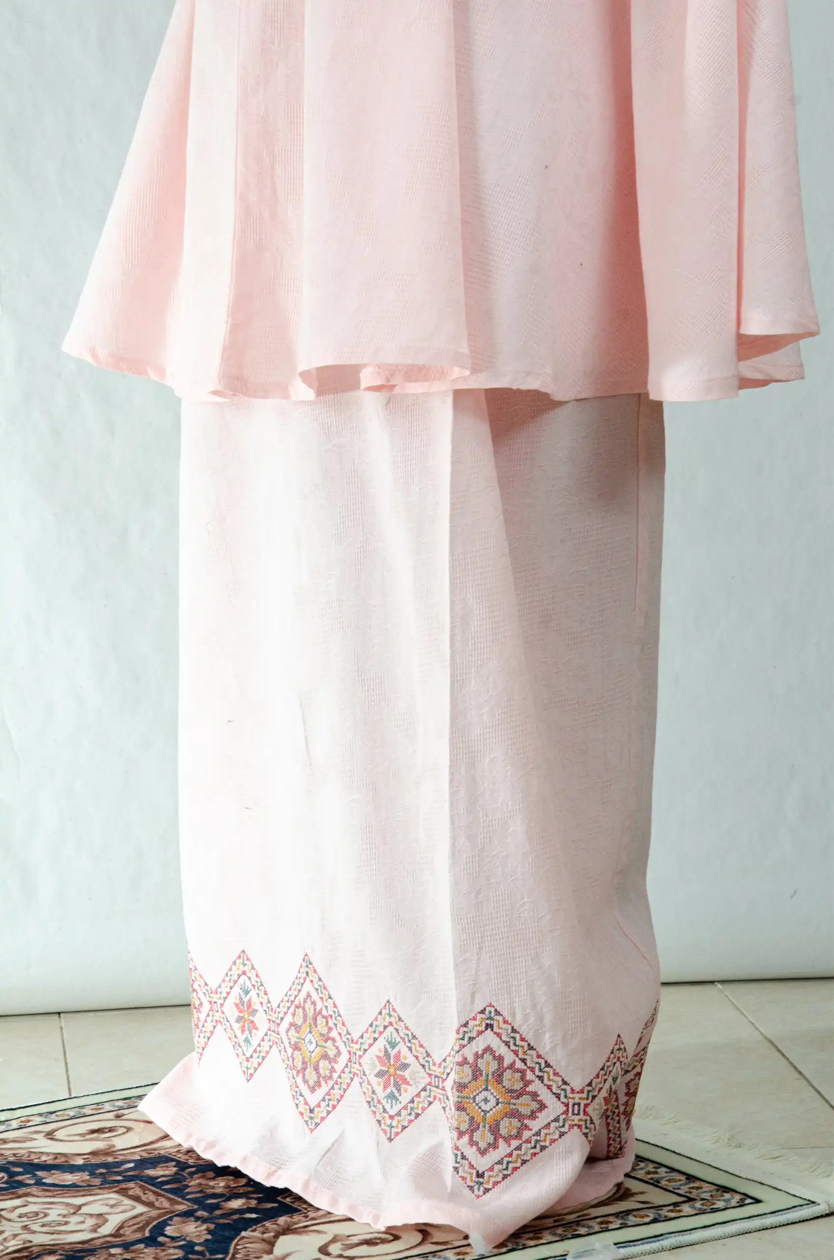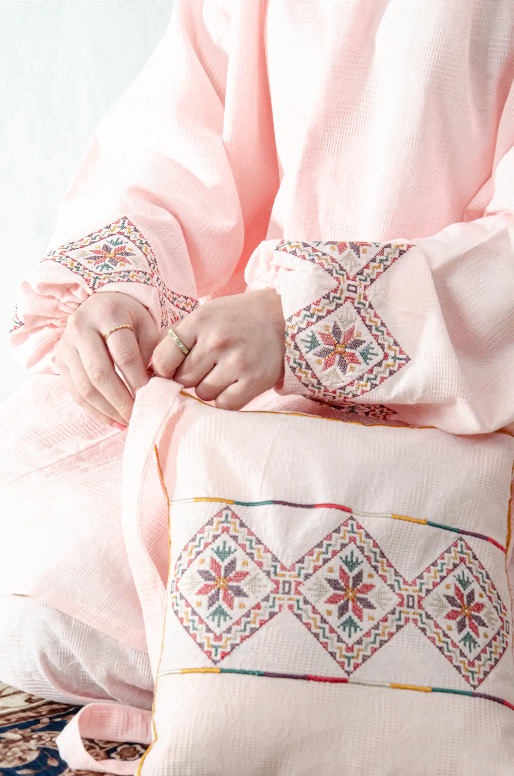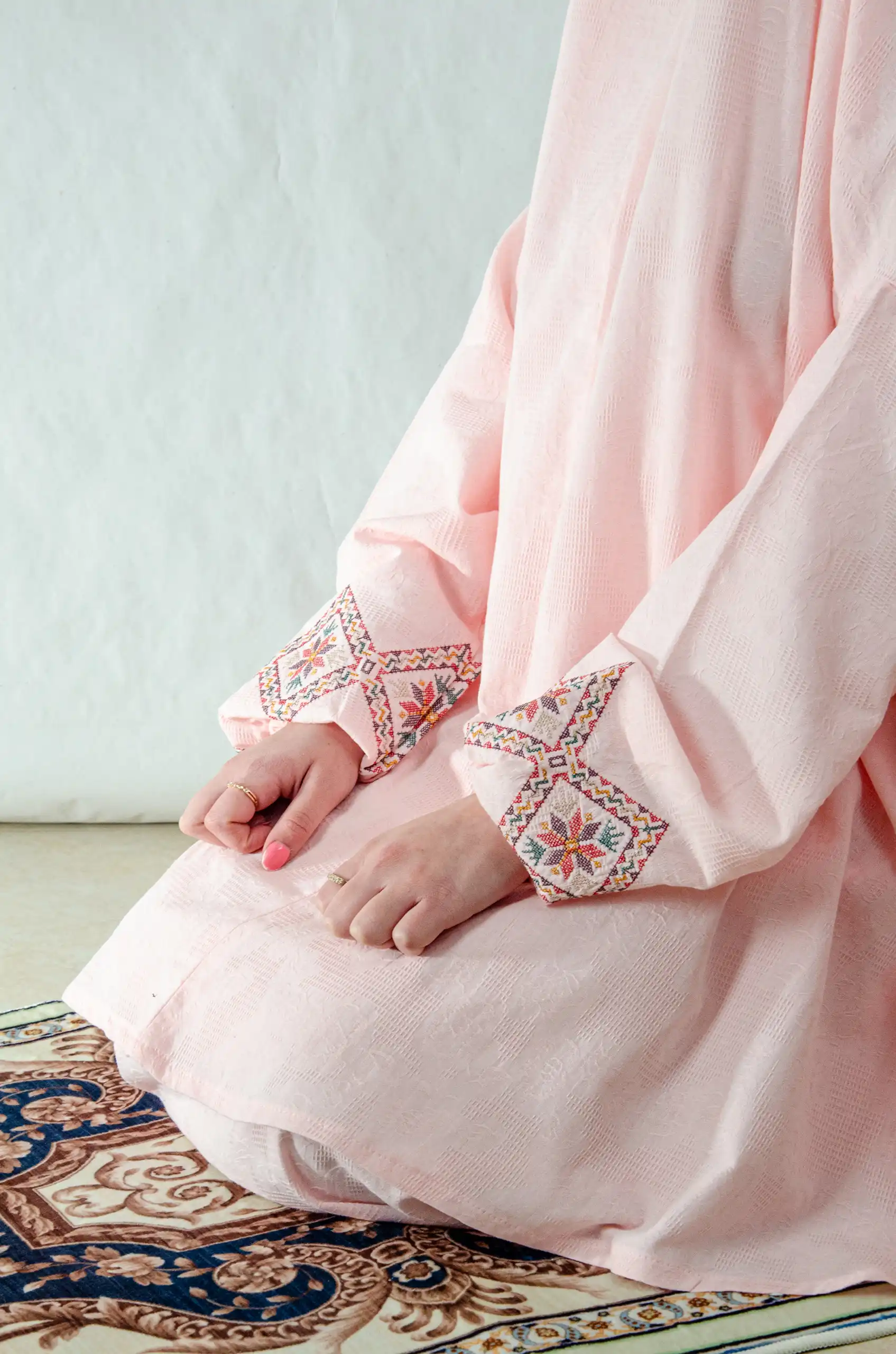 Crafted to honor both worship and heritage, the set combines a soft, breathable fabric with refined Fallahi embroidery inspired by traditional Palestinian handcraft. The neutral pink base enhances the embroidery’s depth and detail, allowing every stitch to stand out with quiet sophistication.